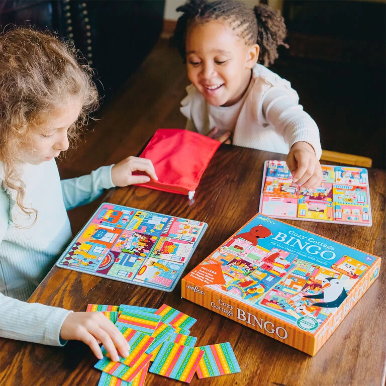 Help sharpen recognition and concentration skills with the Cozy Cottage Bingo Game—a new twist on a classic favorite. Perfect for little learners, this game features adorable animal characters and their houses that serve as bingo cards. As players draw chips from the drawstring bag and match them to their cards, activity bustles—and the first player to fill their animal’s house wins. Artist illustrated by Uta Krogmann, this beautifully designed game inspires creative storytelling and is a fun addition to game night!